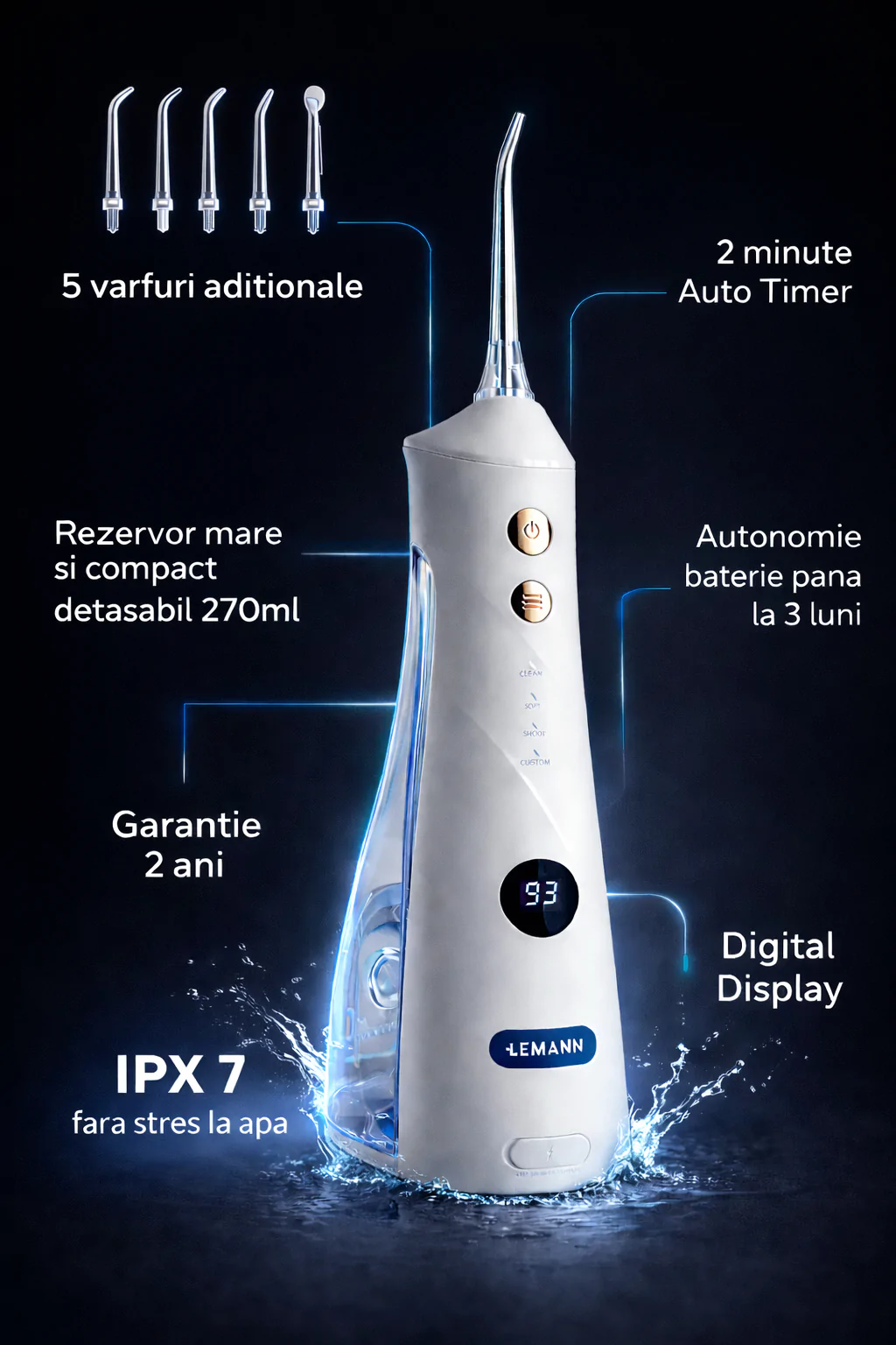 Dezvoltat pentru a asigura o igiena orala excelenta si un zambet stralucitor, irigatorul oral Lemann PRO-7000 este optiunea ideala pentru cei care cauta sa obtina o curatare profunda si sa isi mentina sanatatea gingiilor folosind tehnologie avansata.
