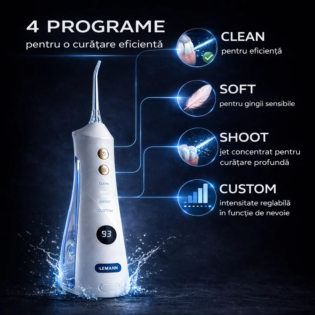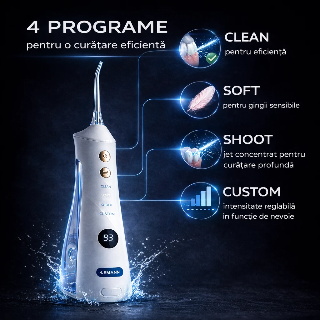 Cu 4 moduri de functionare : Clean, Soft, Shoot si Custom, care ofera posibilitatea setarii intensitatii pulsatiilor, irigatorul Lemann PRO-7000 permite personalizarea experientei de igiena orala. Indicatoarele LED intuitive ajuta la navigarea usoara printre setari, iar presiunea apei variabila, cuprinsa intre 10 si 90 PSI, impreuna cu cele 1400 de pulsatii pe minut, garanteaza o curatare delicata si eficienta.