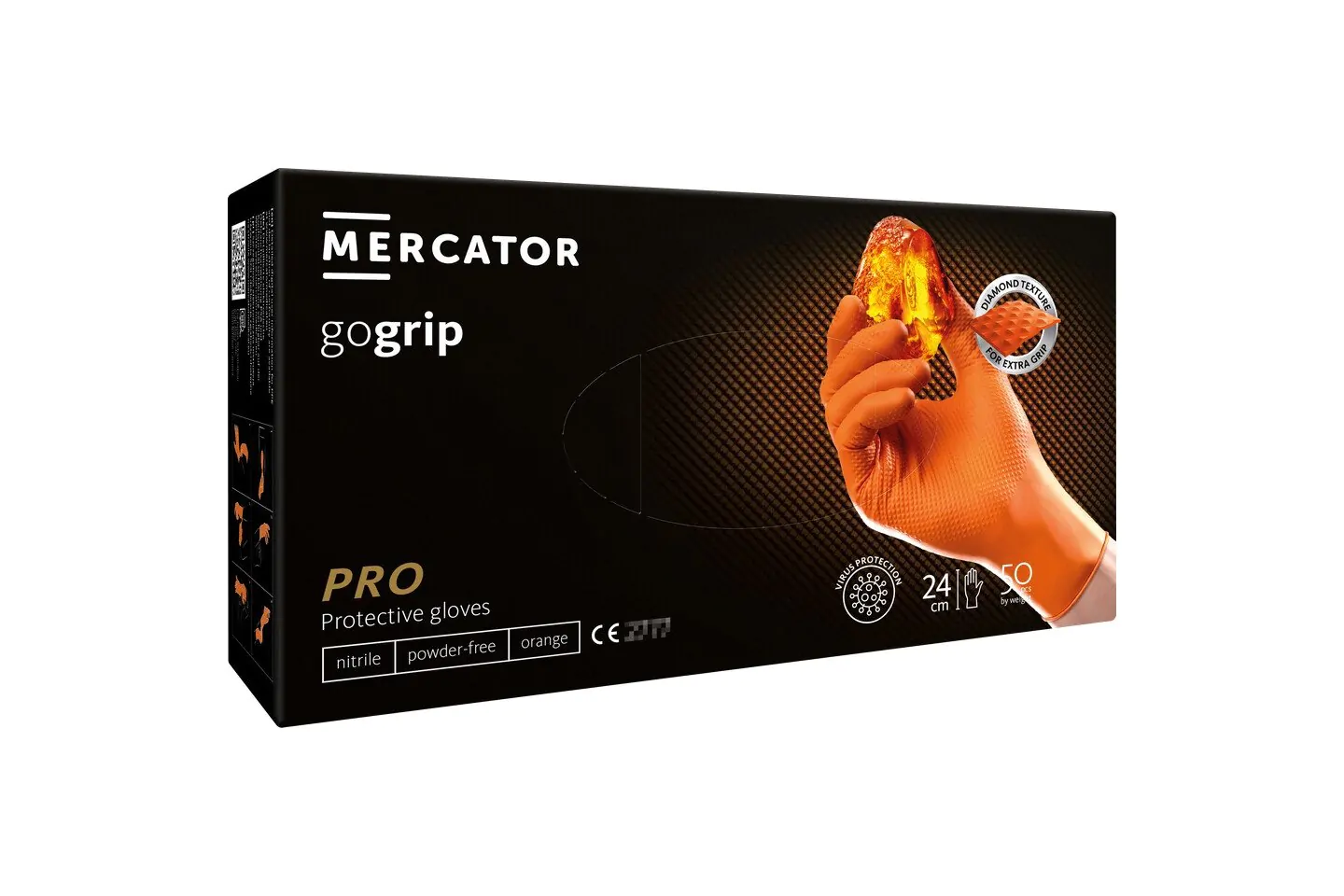 Manusile MERCATOR® GoGrip, exceptional de elastice, sunt de doua ori mai groase decat manusile standard disponibile pe piata. Aceste manusi din nitril robust au o textura unica de diamant 3D, care va face prinderea puternica si sigura, fara a va limita precizia. Structura originala MERCATOR® gogrip va permite sa operati dispozitivele mobile fara a va scoate manusile. In plus, textura revolutionara de diamant 3D previne transpiratia mainilor in timpul folosirii manusilor, creste confortul de utilizare si minimizeaza riscul de deteriorare a pielii.