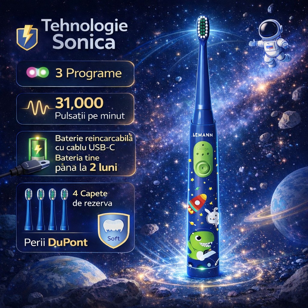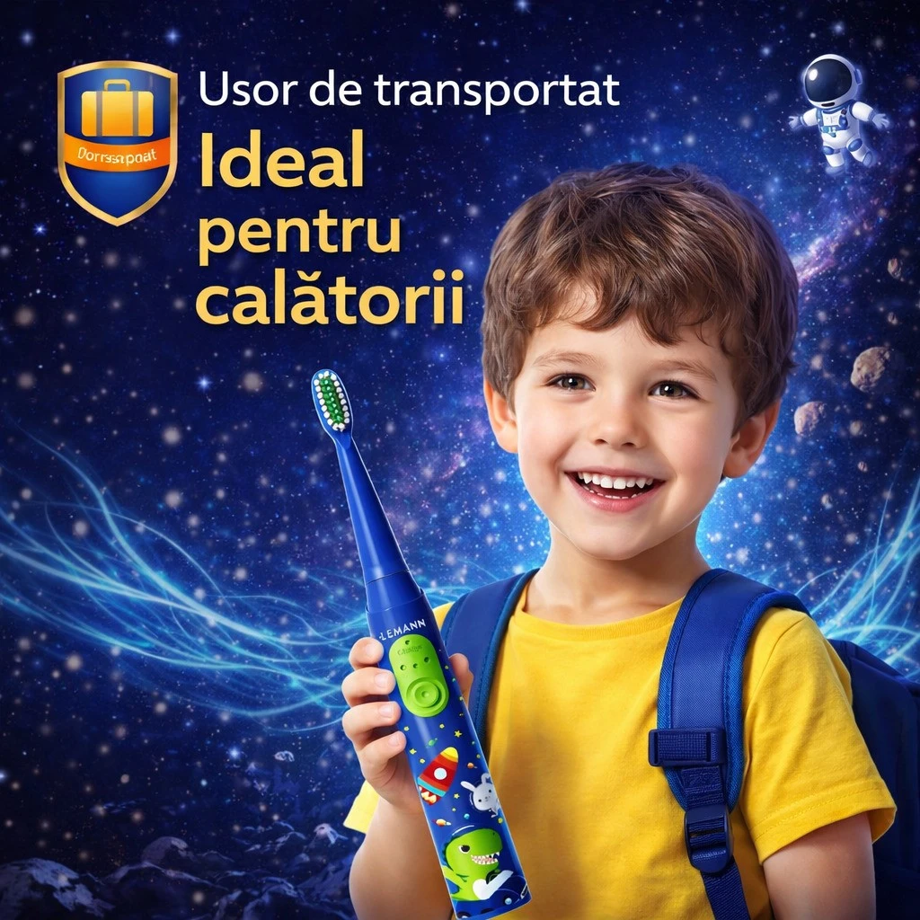 Recomandat pentru: Băieți de la 4 ani; Perioada de tranziție dinți de lapte; dinți permanenți; Băieți care tratează periuța manuală cu indiferență totală; Părinți care vor să transforme periajul într-un ritual fără dramă.