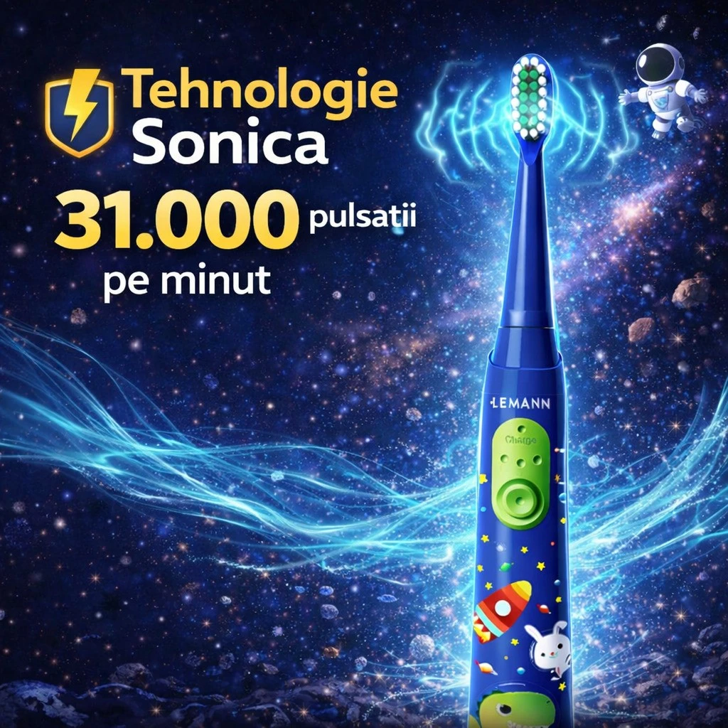 Tehnologia sonică cu până la 31.000 RPM generează micro-vibrații care îndepărtează placa bacteriană inclusiv din zonele greu accesibile — fără să fie nevoie ca băiețelul tău să execute mișcări perfecte de periaj. La 4 ani nimeni nu face mișcări perfecte de periaj. Și e în regulă — periuța compensează.