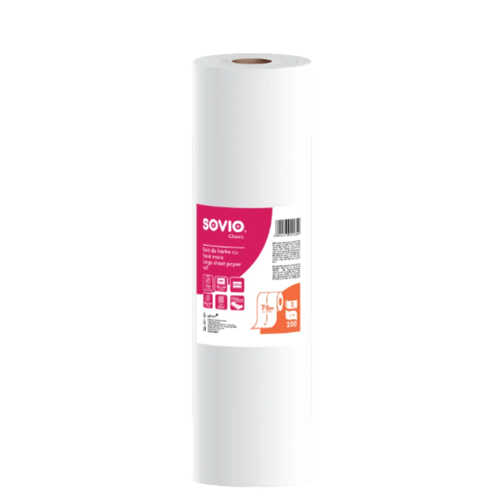 Rezistentă, de dimensiuni generoase, ușor de rulat și desfășurat, rola de hârtie SOVIO este perfectă pentru cabinete medicale, saloane de frumusețe sau orice spațiu care implică igienizarea repetată a suprafețelor.