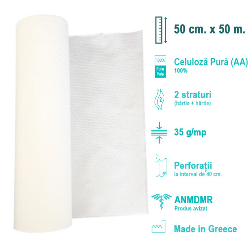 Rola de hârtie de unică folosință, cu 2 straturi lipite, ideală pentru acoperirea suprafețelor din mediile profesionale (cabinete medicale, saloane, clinici etc.). Fabricată din două straturi de hârtie pură (35 g/mp), oferă absorbție excelentă și un plus de confort. Hârtia este embosată, are o culoare albă intensă și o textură moale, fiind perforată la fiecare 40 cm pentru o utilizare facilă.